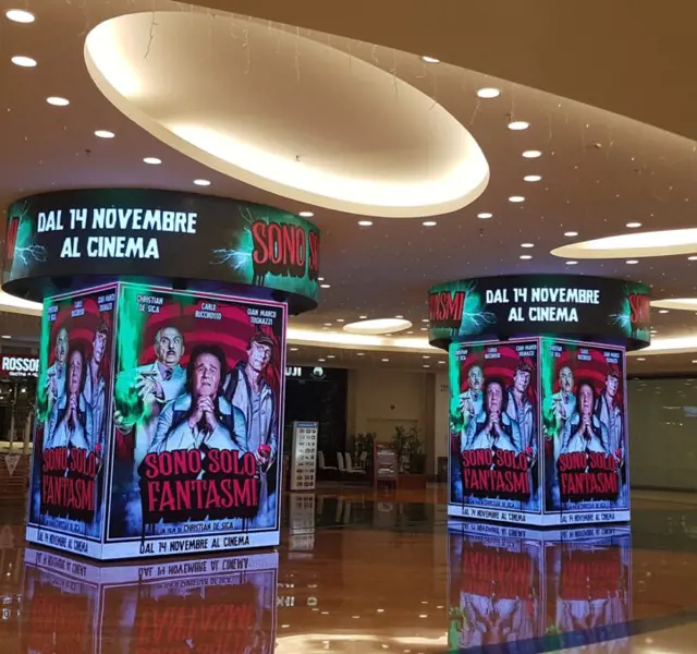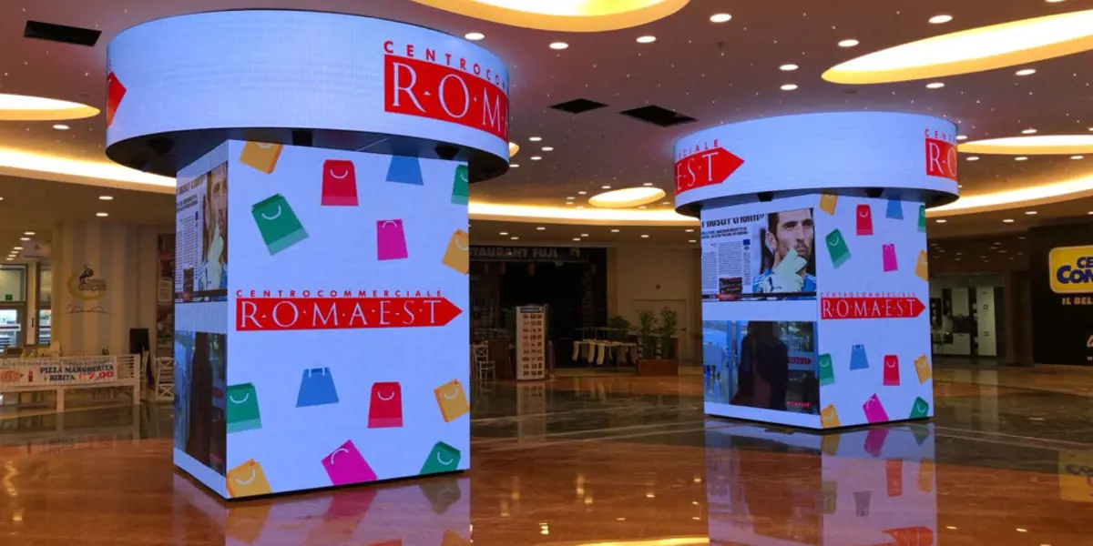 Our project for East Rome Shopping Centre is a Retail application of our curved LED screens. The design is very interesting, consisting of LED squared columns, surmounted by a circular LED capital.