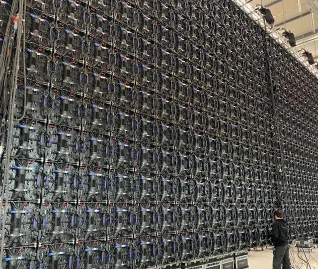 The project for the 70 m² indoor ledwall required a great design effort, given the load-bearing structure and the total weight of the suspended screen.