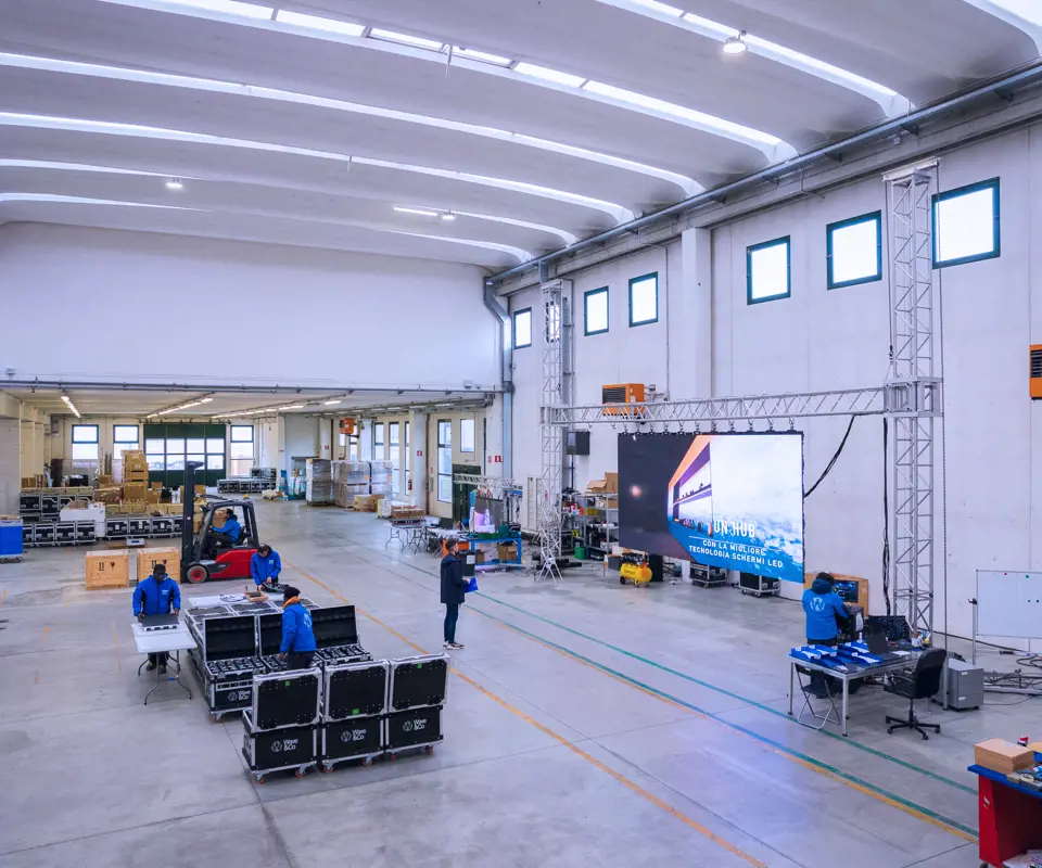 A space entirely dedicated to the storage of over 3,000 m² of LED screens available for immediate delivery.