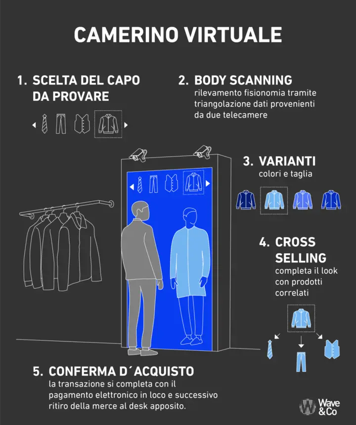 - La fruizione degli spazi all’interno del negozio sia razionalizzata, con i clienti che potenzialmente possono visualizzare tutto l’assortimento disponibile comodamente dal camerino virtuale.