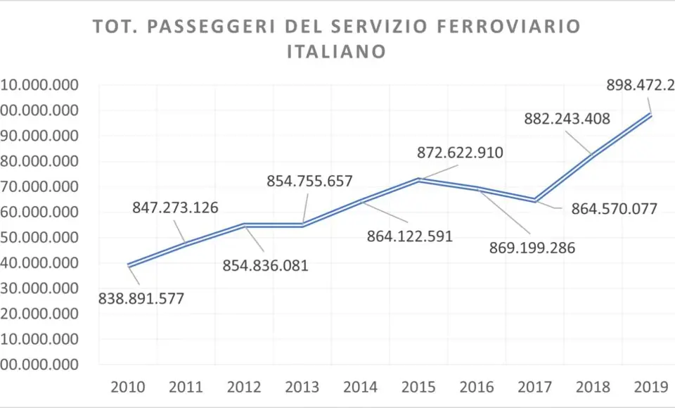 Tuttavia, analizzando il trend pre-Covid-19, si può notare come la crescita fosse decisamente importante. Dopo due anni di leggera flessione, nel 2018 e 2019 il numero dei passeggeri totali delle ferrovie italiane è aumentato in media del 2% all’anno, pari a circa 17 milioni all’anno (fonte: Istat), attestandosi a 898 milioni di utenti nel 2019, un numero