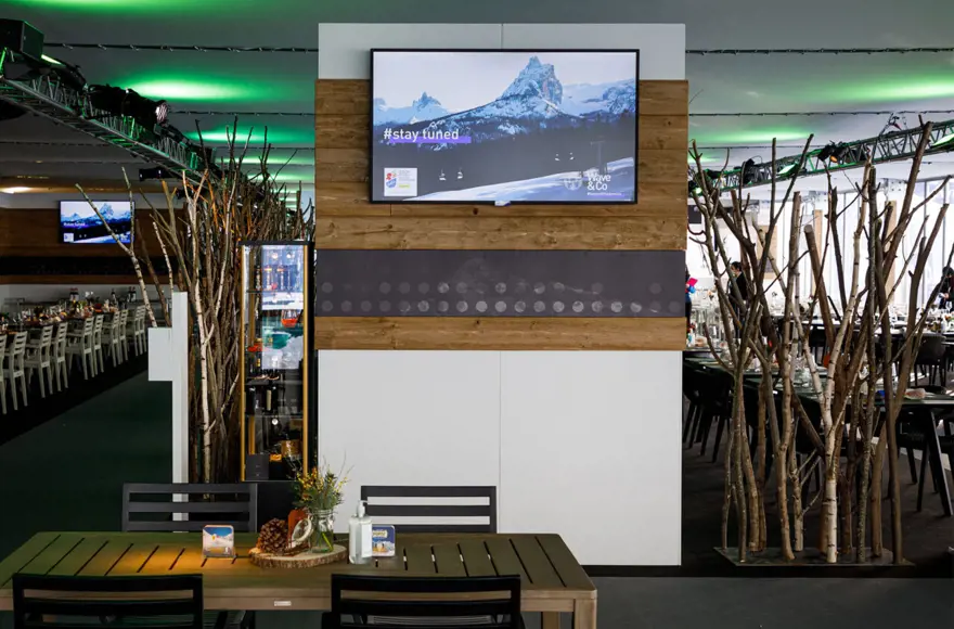 Per gli allestimenti funzionali all’interno della Tenda Tofana Lounge, del Media Centre che ospita i giornalisti di tutto il mondo e tutte le aree di servizio, Wave&Co ha allestito 130 TV monitor.